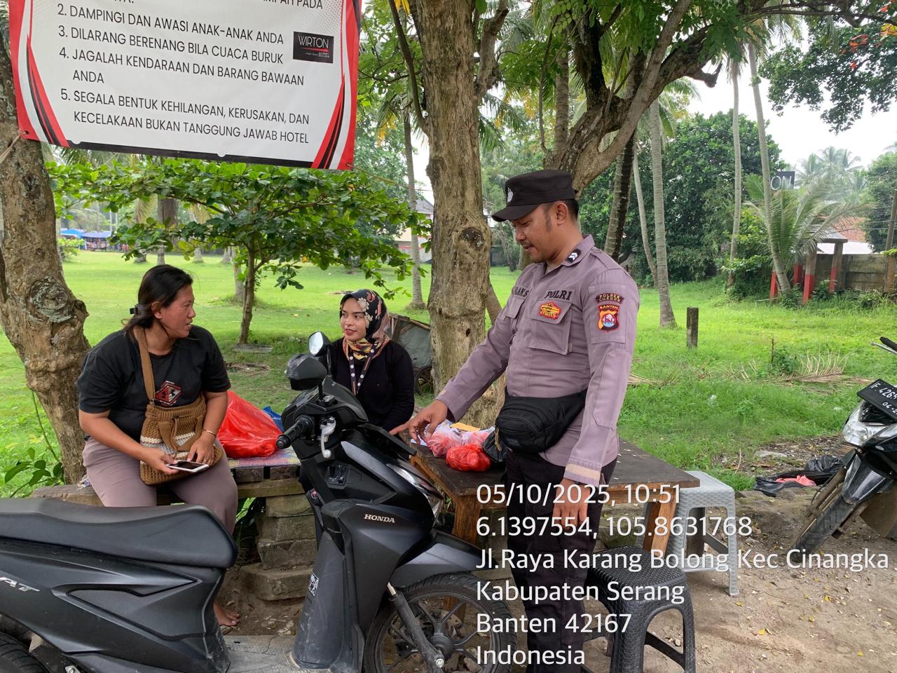 _*POLRES CILEGON*_ | Polsek Cinangka Polres Cilegon Polda Banten melaksanakan kegiatan patroli Serta memberikan Himbauan kepada pengunjung pantai yang berwisata dan Sambang kepada petugas penjaga pantai dan juga antisipasi harkamtibmas di Wilayah Hukum Polsek Cinangka Polres Cilegon Polda Banten, Minggu (05/10/2025).
