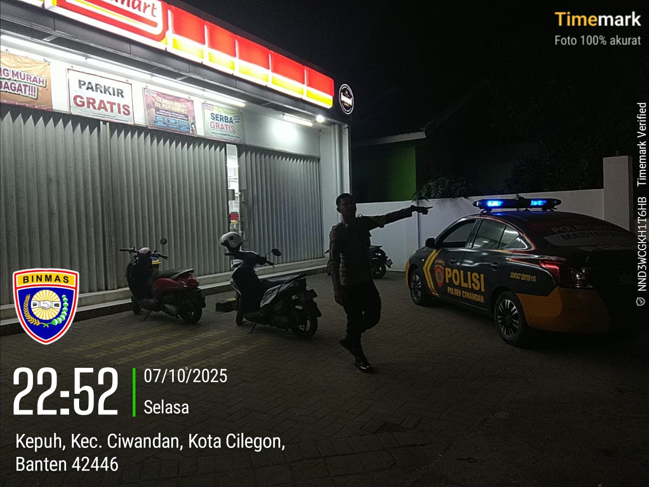 Cilegon - Personil Polsek Ciwandan Polres Cilegon Polda Banten melaksanakan patroli malam untuk mengantisipasi potensi kejahatan, khususnya pembobolan minimarket, di daerah hukum Polsek Ciwandan. Kegiatan ini bertujuan untuk meningkatkan keamanan dan memberikan rasa aman kepada masyarakat, Rabu (08/10/2025).
