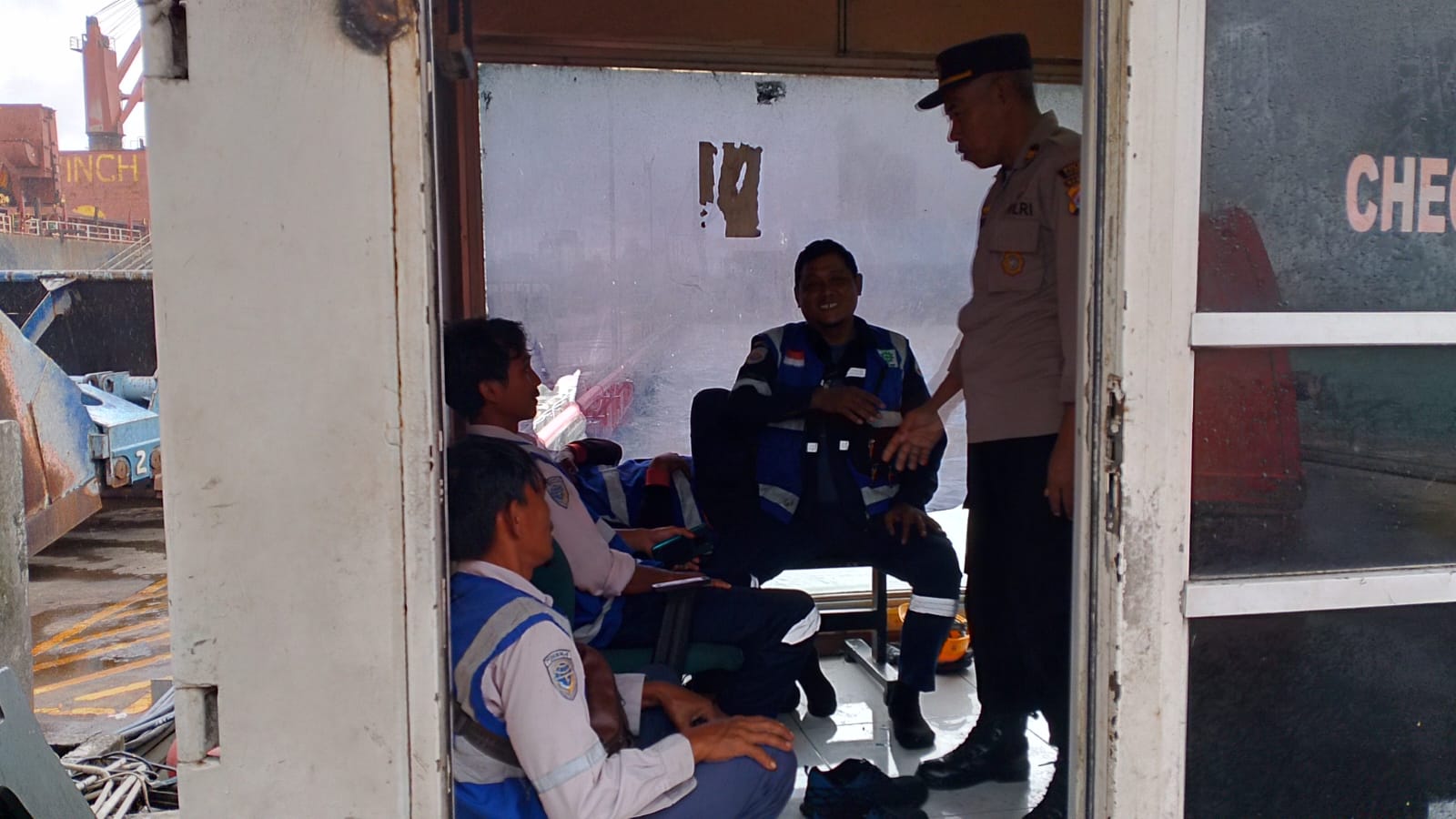 Jalin Silaturahmi, Bhabinkamtibmas Pelabuhan Polsek Kawasan Pelabuhan Banten berbincang dengan Buruh Pelabuhan