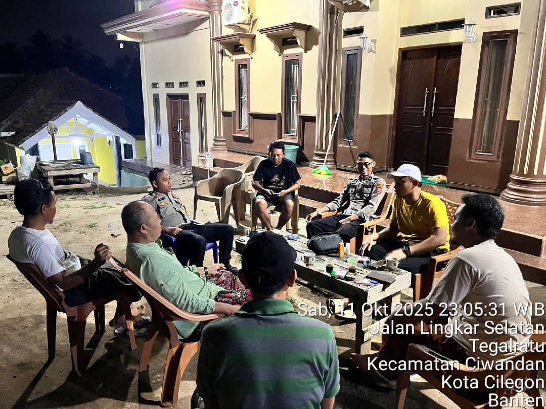 Cilegon - Bhabinkamtibmas Polsek Ciwandan Polres Cilegon Polda Banten Melaksanakan Patroli Kunjungan Malam dan terus memberikan pembinaan dan penyuluhan tentang pentingnya menjaga kamtibmas di daerah hukum Polsek Ciwandan Polres Cilegon Polda Banten, Minggu (12/10/2025).