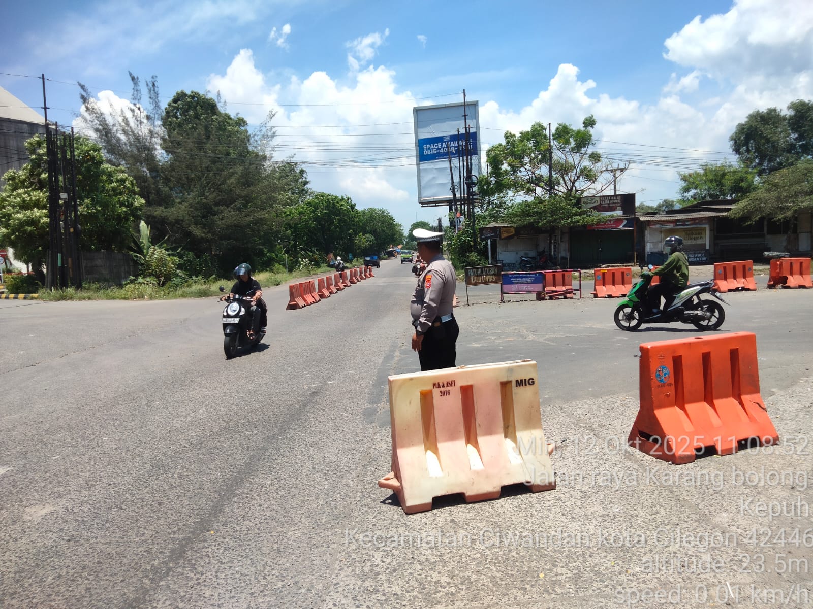 Cilegon - Personil Unit Lantas Polsek Ciwandan Polres Cilegon Polda Banten melaksanakan kegiatan monitoring jalur wisata di depan Pos Lantas JLS Ciwandan, Minggu, (12/10/2025).