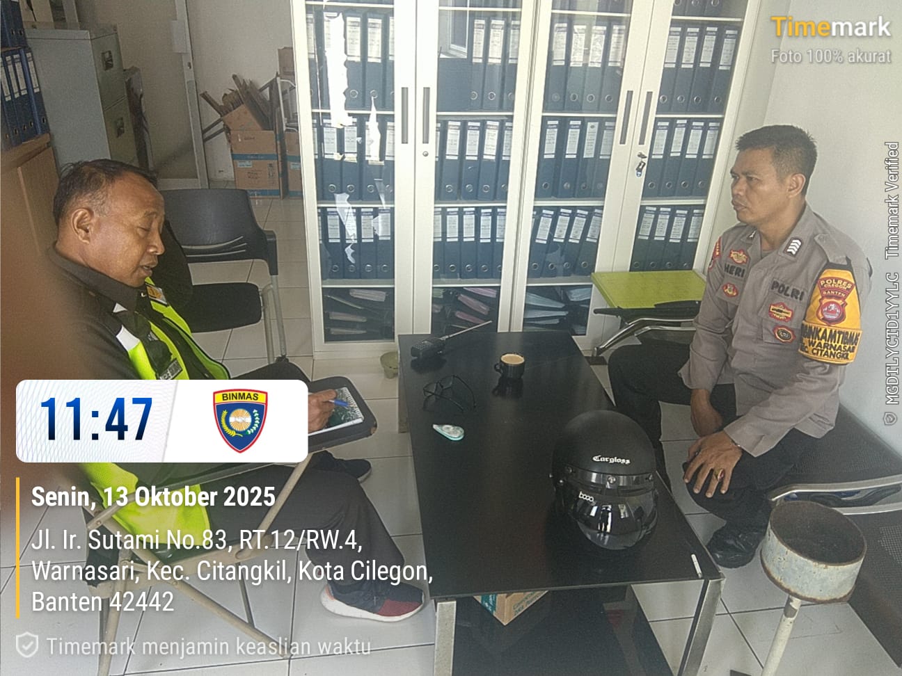 Cilegon –  Bhabinkamtibmas Polsek Ciwandan Polres Cilegon Polda Banten Laksanakan Silaturahmi Polri serta Patroli Dialogis Pembinaan Satpam/Security dan Guna Memelihara Harkamtibmas, Sebagai Petugas satuan pengamanan atau security merupakan bagian dari mitra dan kepanjang tanganan tugas Polri yang membantu melaksanakan pengamanan, Selasa (13/10/2025).
