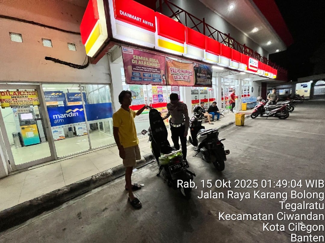 Cilegon - Personil Polsek Ciwandan Polres Cilegon Polda Banten melaksanakan patroli malam untuk mengantisipasi potensi kejahatan, khususnya pembobolan minimarket, di daerah hukum Polsek Ciwandan. Kegiatan ini bertujuan untuk meningkatkan keamanan dan memberikan rasa aman kepada masyarakat, Rabu (15/10/2025).