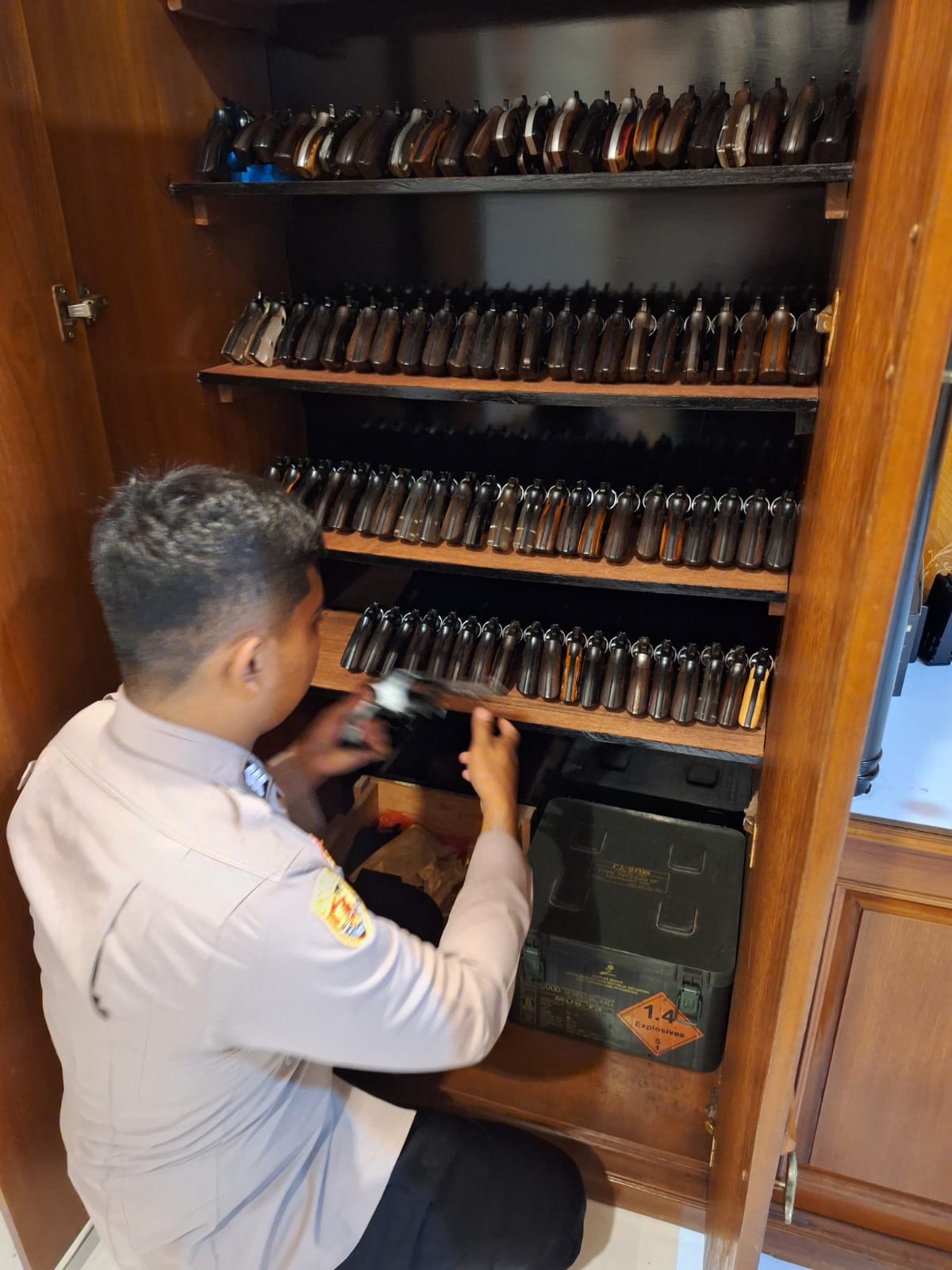 STAFF LOGISTIK MEMBERSIHKAN SENJATA API DI GUDANG POLRES CILEGON