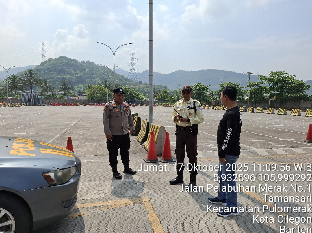 Cilegon - Personel Polsek Kskp Merak Polres Cilegon Polda Banten melaksanakan sambang dan patroli kawasan pelabuhan merak dalam rangka menjaga Harkamtibmas di Kawasan Pelabuhan Merak, Jumat (17/10/2025).