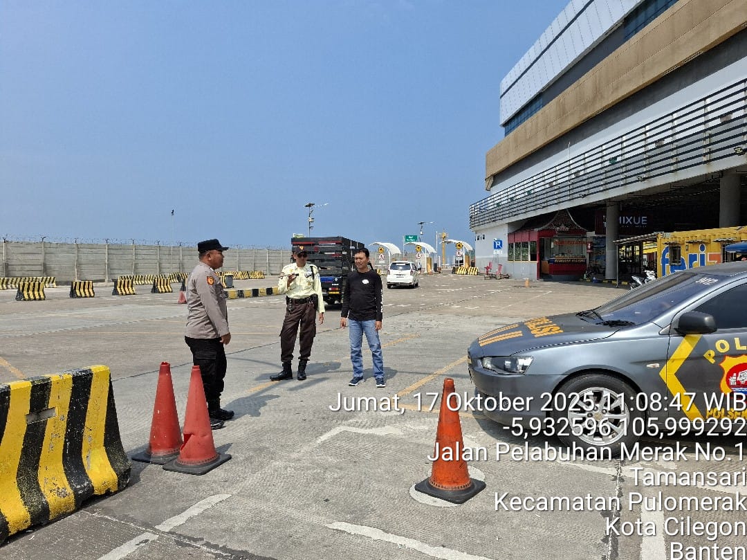 Cilegon - Personel Polsek Kskp Merak Polres Cilegon Polda Banten melaksanakan sambang dan patroli kawasan pelabuhan merak dalam rangka menjaga Harkamtibmas di Kawasan Pelabuhan Merak, Jumat (17/10/2025).