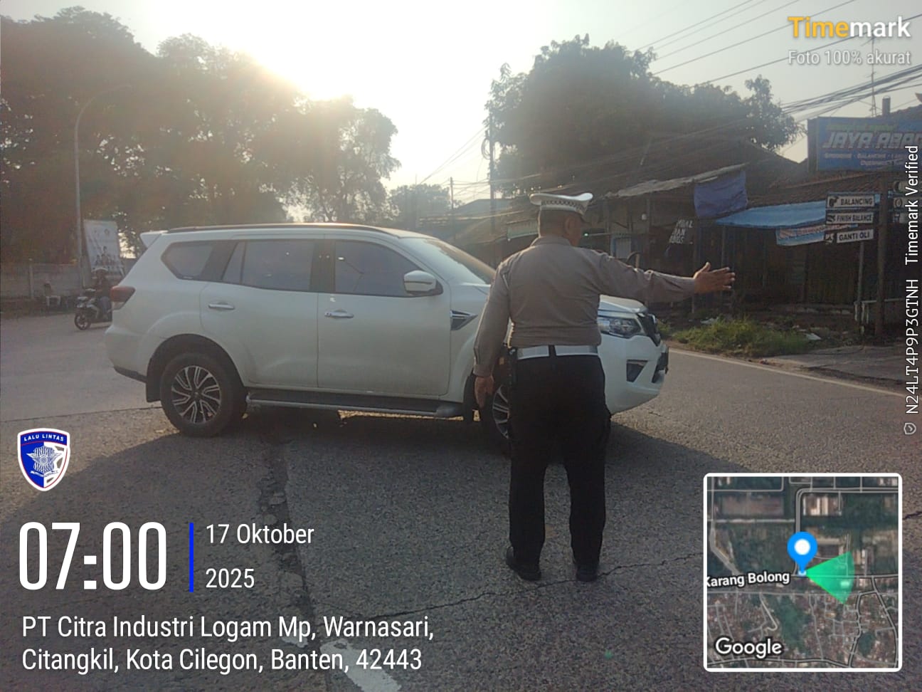 Cilegon - Personil Polsek Ciwandan Polres Cilegon Polda Banten melaksanakan giat Strong Poin Pengaturan Lalu Lintas Disimpang Brown Kelurahan Gunung Sugih guna menciptakan ketertiban, keamanan dan Kelancaran Lalu-lintas bagi masyarakat, Jum’at (17/10/2025).