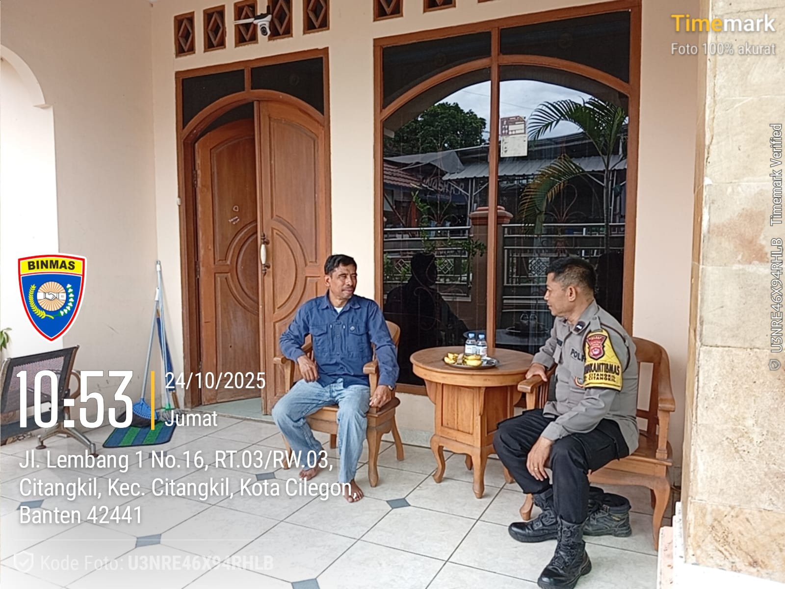 Cilegon - Bhabinkamtibmas Polsek Ciwandan Polres Cilegon Polda Banten  Melaksanakan kegiatan Dialogis/Sambang Door to Door Sistem (DDS) Di daerah binaannya serta memberikan Pesan-pesan Kamtibmas Guna Menciptakan situasi Harkamtibmas yang Aman dan nyaman, Sabtu (25/10/2025).