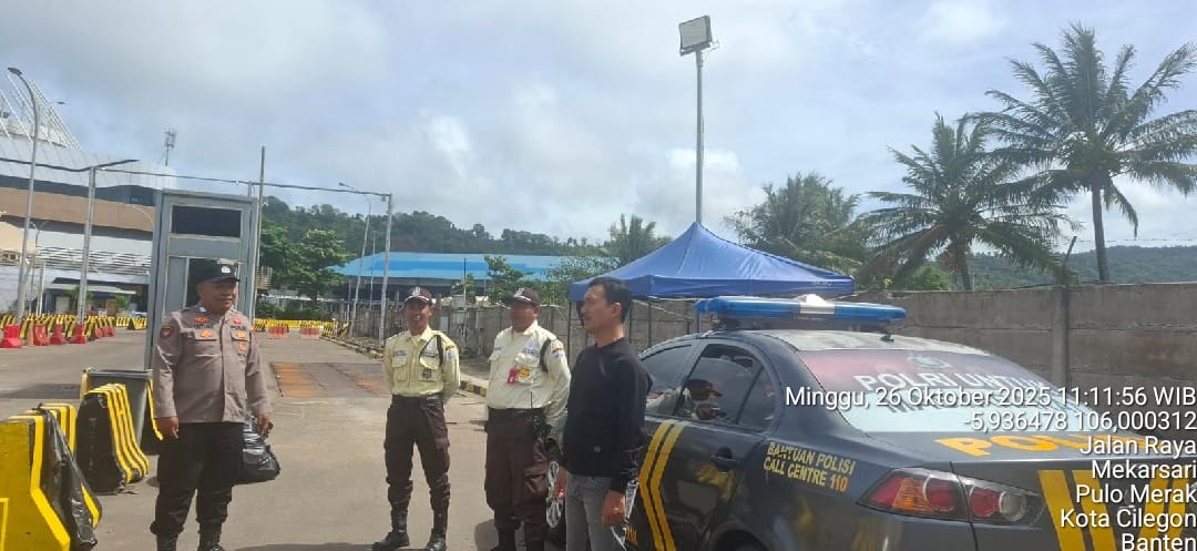 Cilegon - Personel Polsek Kskp Merak Polres Cilegon Polda Banten melaksanakan sambang dan patroli kawasan pelabuhan merak dalam rangka menjaga Harkamtibmas di Kawasan Pelabuhan Merak, Minggu (26/10/2025).