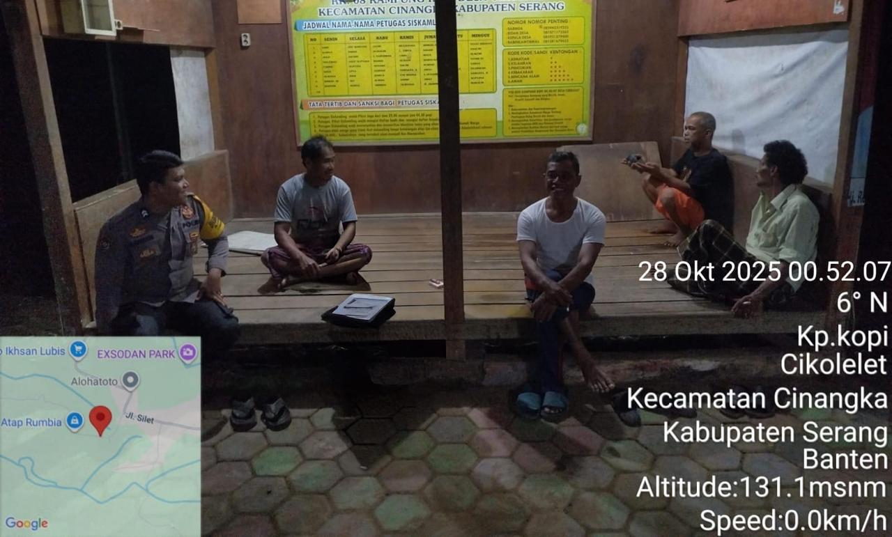 *Polres Cilegon* || Personel Bhabinkamtibmas Polsek Cinangka melaksanakan Program Komandan Wish Kapolda Banten RONDA SATKAMLING menyampaikan komunikasi dengan Petugas Siskamling agar berperan aktif dalam menciptakan Harkamtibmas yang aman dan Kondusif, Selasa (28/10/2025).