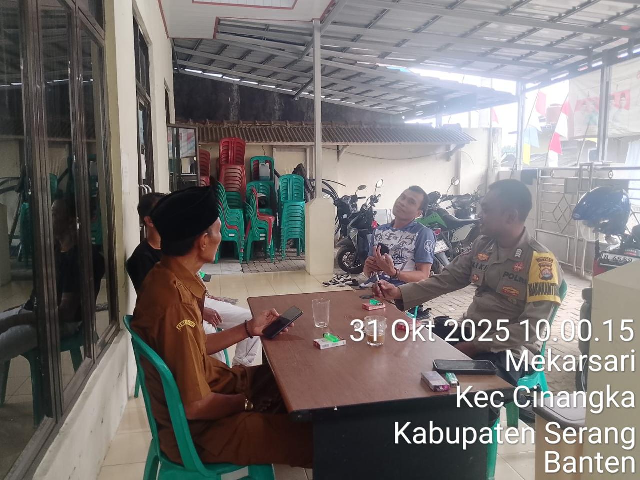 *CILEGON* dalam Rangka Mengantisipasi Gktm di wilayah Personil Bhabinkamtibmas Cinangka melakukan patroli Dialogis dengan Kepala Desa dan warga dan Menanyakan situasi Kamtibmas di wilayah dalam Rangka Menjaga Harkamtibmas di Desa Binaannya Kecamatan Cinangka Kab. Serang. Jumat.(31/10/2025).