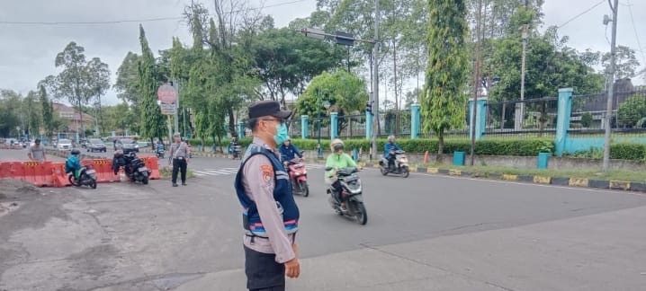 Personel Babinkamtibmas Kelurahan Ramanuju, Bripka Anto Maulana, melaksanakan pengaturan lalu lintas pagi di persimpangan lampu merah ADB