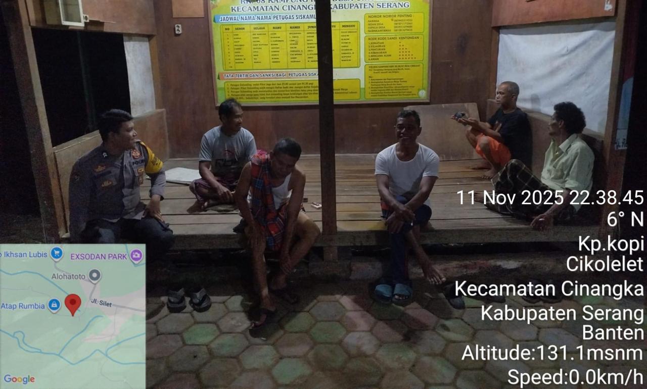 *Polres Cilegon* || Personil Bhabinkamtibmas Polsek Cinangka melaksanakan Program Komandan Wish Kapolda Banten RONDA SATKAMLING menyampaikan komunikasi dengan Petugas Siskamling agar berperan aktif dalam menciptakan Harkamtibmas yang aman dan Kondusif, Rabu (12/11/2025).