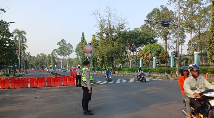 pengaturan lalu lintas pagi di tengah rintik hujan