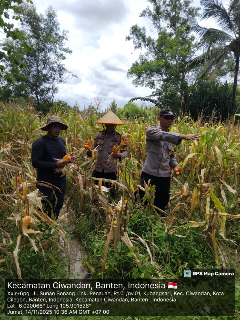 Cilegon - Polsek Ciwandan Polres Cilegon Polda Banten mendukung kegiatan panen jagung Hibrida hasil penanaman Kelompok Tani Kubang Lestari I di Kelurahan Kubangsari Kecamatan Ciwandan, Kota Cilegon, Jum’at (14/11/2025).