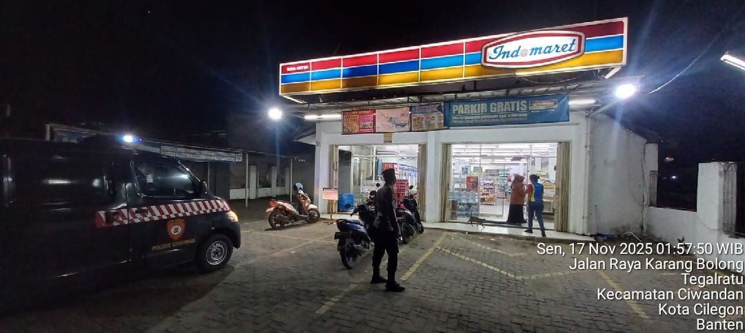 Cilegon - Patroli ini digelar oleh personil Polsek Ciwandan Polres Cilegon Polda Banten untuk Menekan Gangguan Kamtibmas dan mengantisipasi aksi kriminalitas Pada Jam-jam Rawan di pertokoan ataupun minimarket ,Di samping Patroli petugas juga melakukan himbauan dialogis baik dengan karyawan maupun para pengunjung, Senin (17/11/2025).