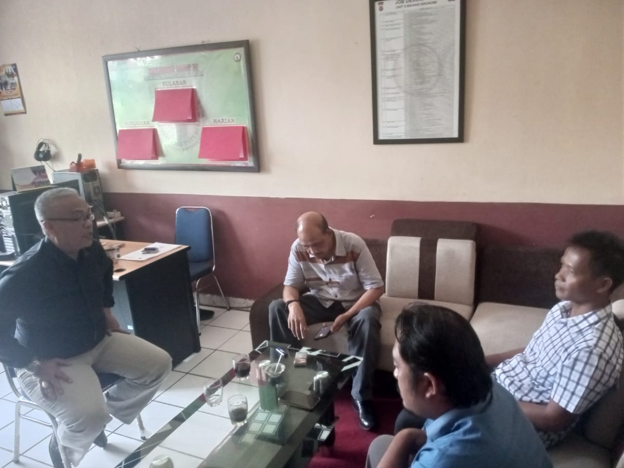 Personil sat intelkam melakukan koordinasi dengan tokoh masyarakat kelurahan kalitimbang kec. Cibeber kota cilegon.