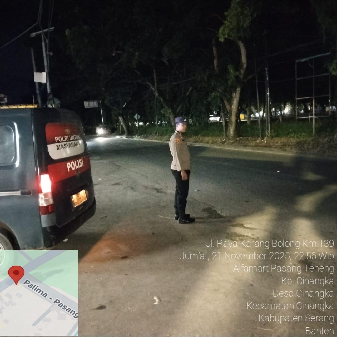 *Polres Cilegon* – Dalam Rangka Pencegahan Kejahatan Jalanan dan Memelihara situasi keamanan dan menjaga serta memberikan rasa aman dan nyaman di masyarakat,Salah satu upaya untuk mewujudkan hal tersebut sebagaimana yang dilakukan oleh Personil Polsek Cinangka Polres Cilegon Polda Banten melaksanakan giat patroli blue light malam hari hingga menjelang pagi, Sabtu (22/11/2025).