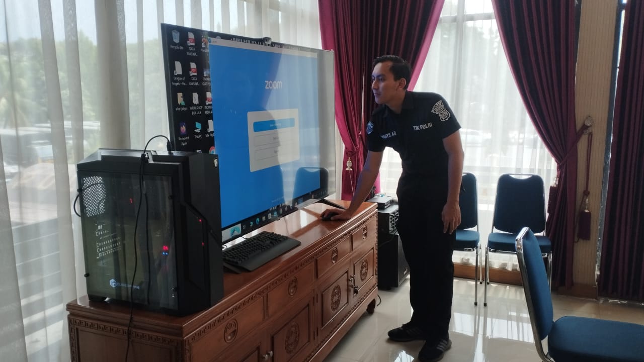 Anggota Tik Polres Cilegon Menyiapkan Sarana dan Prasarana Untuk Kegiatan Zoom meeting Dalam pelaksanaan kegiatan zoom meeting tersebut anggota TIK Polres Cilegon yang bertanggung jawab untuk menyiapkan peralatan zoom. Selain itu agar di tidak ada gangguan jaringan sebelum pelaksanaan anggota TIK melakukan pemeriksaan terhadap sarana dan prasarana tersebut . Satu jam sebelum kegiatan zoom meeting itu dimulai. Kapolres Cilegon AKBP. DR. MARTUA RAJA TARIPAR LAUT SILITONGA. melalui Kasi TIK IPTU Lukman menyampaikan bahwa “untuk menunjang kelancaran penyampaian informasi anggota TIk Polres Cilegon selalu memeriksa sarana dan prasarana tersebut, sebelum maupun pada saat pelaksanaan akan selalu di monitor