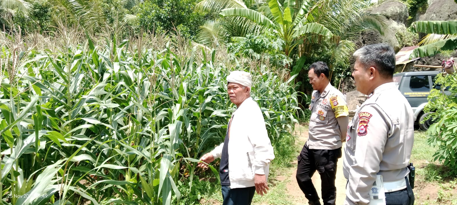 Cilegon – Dalam rangka mendukung program ketahanan pangan nasional dan swasembada pangan Bhabinkamtibmas Polsek Anyar melaksanakan kegiatan sambang dan monitoring lahan pertanian jagung di Desa Bunihara, Kecamatan Anyar, Kabupaten Serang. Selasa (25/11)