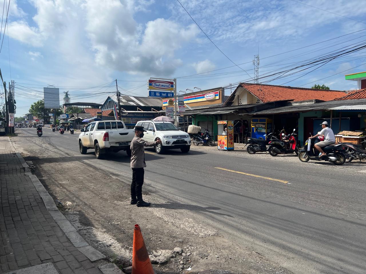 Anggota Polres Cilegon melaksanakan Pengaturan Arus Lalin atau Gatur Strong Point di arah jalur Wisata Pantai Anyer Banten.