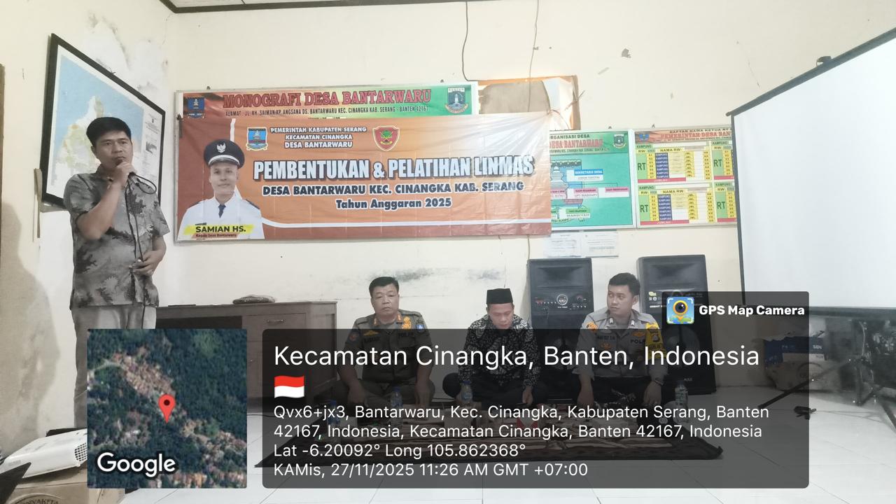 *CILEGON* dalam Rangka Mengantisipasi Gktm di wilayah Personil Bhabinkamtibmas Cinangka melakukan patroli Dialogis dengan Kepala Desa dan warga dan Menanyakan situasi Kamtibmas di wilayah dalam Rangka Menjaga Harkamtibmas di Desa Binaannya Kecamatan Cinangka Kab. Serang. Kamis (27/11/2025).
