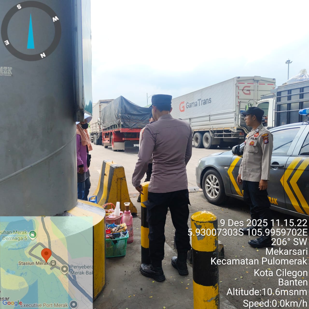 Cilegon - Personel Polsek Kskp Merak Polres Cilegon Polda Banten melaksanakan sambang dan patroli kawasan pelabuhan merak dalam rangka menjaga Harkamtibmas di Kawasan Pelabuhan Merak, Selasa (09/12/2025).