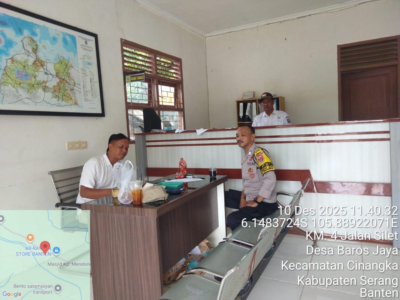 *CILEGON* dalam Rangka Mengantisipasi Gktm di wilayah Personil Bhabinkamtibmas Cinangka melakukan patroli Dialogis dengan Kepala Desa dan warga dan Menanyakan situasi Kamtibmas di wilayah dalam Rangka Menjaga Harkamtibmas di Desa Binaannya Kecamatan Cinangka Kab. Serang. Rabu (10/12/2025).