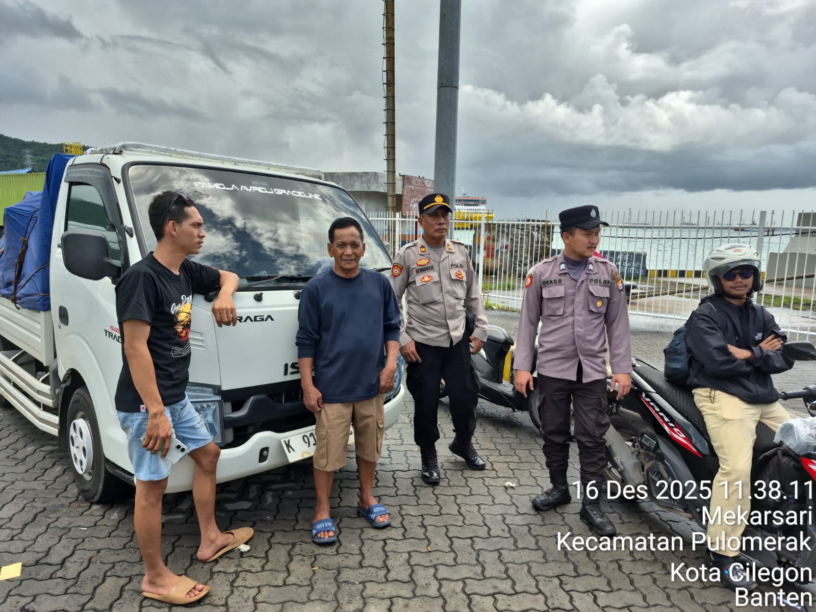 Cilegon - Personel Polsek Kskp Merak Polres Cilegon Polda Banten melaksanakan sambang dan patroli kawasan pelabuhan merak dalam rangka menjaga Harkamtibmas di Kawasan Pelabuhan Merak, Selasa (16/12/2025).