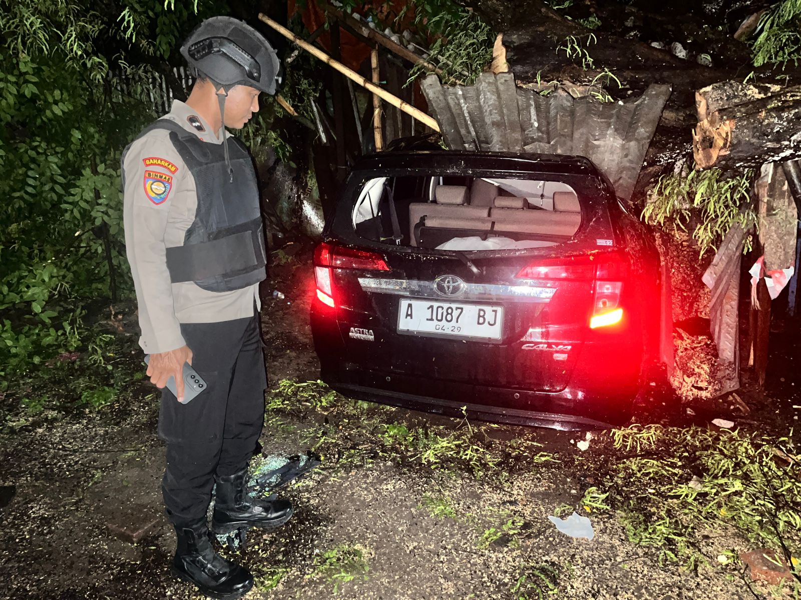 Cilegon - Pohon tumbang di Link Kubang Welut, Rt 02/04, Kel. Kubangsari, Kec. Ciwandan, Kota Cilegon, menimpa kendaraan R4 Toyota Caliya A 1087 BJ yang sedang terparkir, Selasa (16/12/2025).