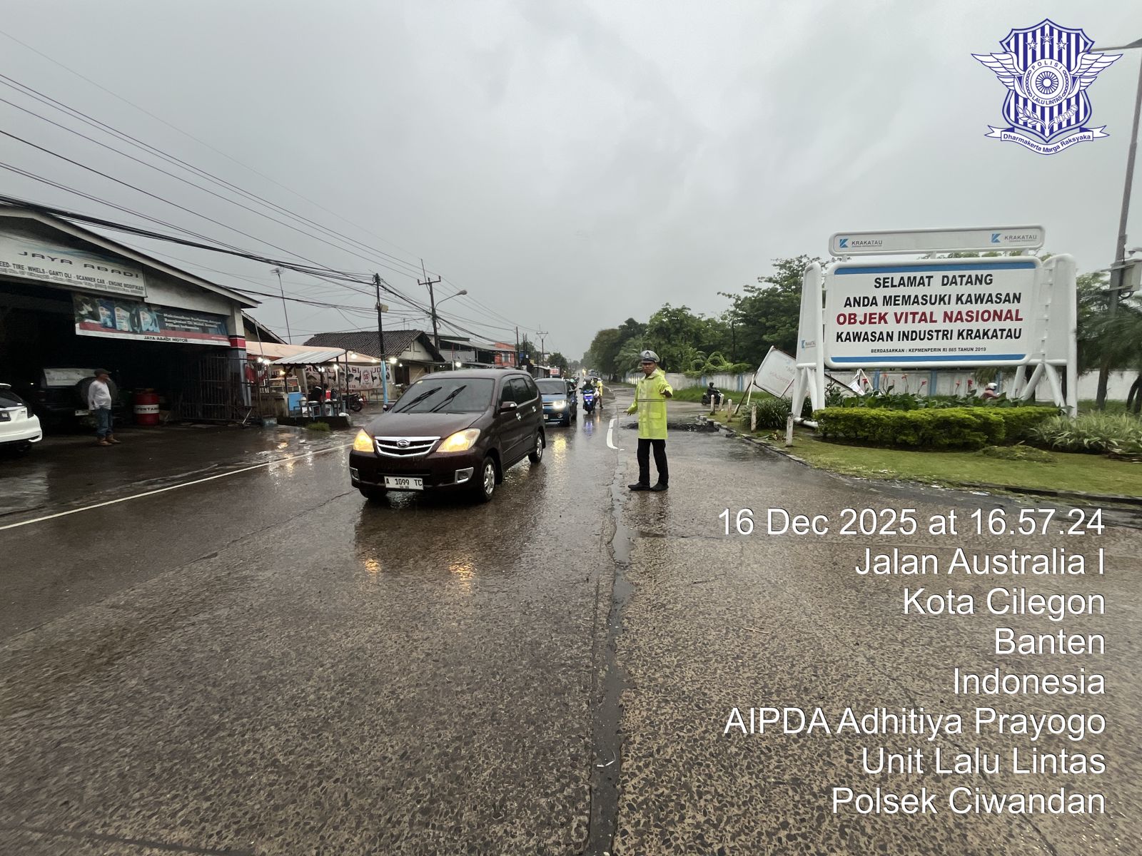 Cilegon - Guna Kelancaran Lalu-lintas Personil Unit Lantas Polsek Ciwandan Polres Cilegon Polda Banten melaksanakan pengaturan lalu-lintas di Simpang Beringin Ciwandan Pertigaan Kawasan Industri KSP/ KIEC I  kelurahan Warnasari Kecamatan Citangkil Kota Cilegon, Rabu (17/12/2025).