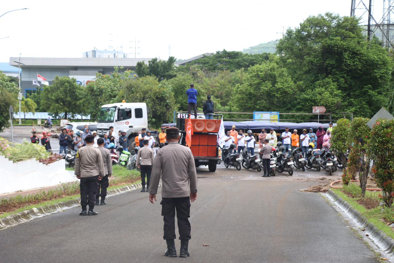 Cilegon – Polres Cilegon Polda Banten melaksanakan pengamanan kegiatan aksi unjuk rasa yang digelar Federasi Serikat Pekerja Metal Indonesia (FSPMI) Kota Cilegon di depan gerbang Wisma KS, Kantor Pusat PT. Krakatau Jasa Logistik (KJL), Kawasan Industri Krakatau Engineering, Kecamatan Purwakarta, Kota Cilegon, Kamis (18/12/2025).