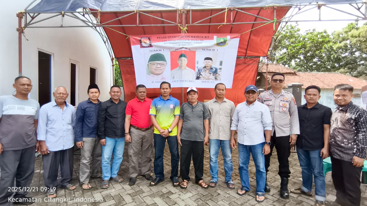 Cilegon -  Bhabinkamtibmas Kelurahan Tamanbaru Polsek Ciwandan Polres Cilegon Polda Banten AIPDA Ediyanto menghadiri pemilihan Ketua RW 003 Lingkungan Kubang Lesung kelurahan Tamanbaru Kecamatan Citangkil Kota Cilegon, Minggu (21/12/2025).