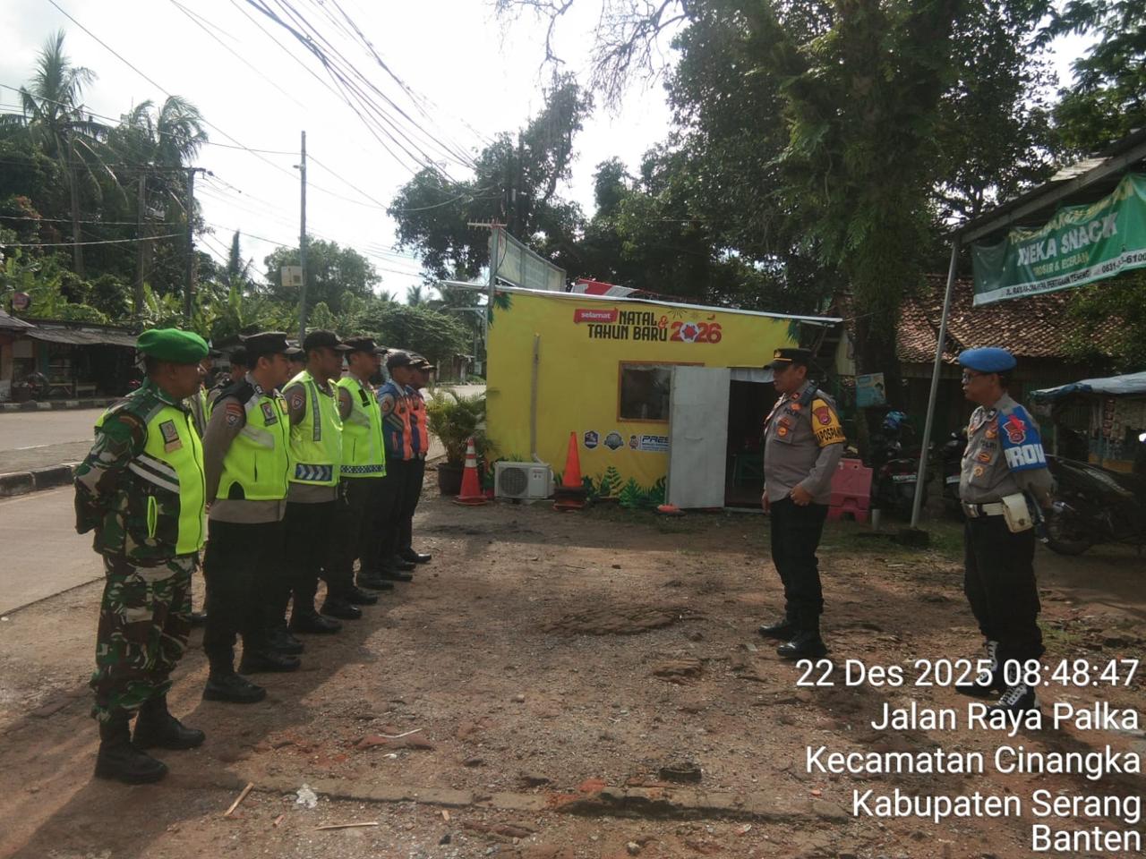 *POLRES CILEGON* Polda Banten. Menjaga kegiatan dan memastikan Aman Polsek Cinangka Polres Cilegon terjunkan Petugas menjaga pengamanan kegiatan PAM Natal dan tahun baru di Pospam Cinangka Kecamatan Cinangka. Senin (22/12/2025).