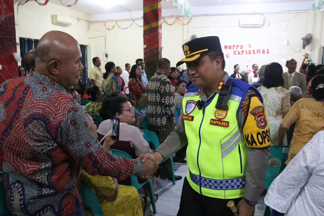 Forkopimda turut menyampaikan ucapan selamat Natal kepada jemaat serta membagikan bunga dan bingkisan sebagai bentuk perhatian dan simbol damai Natal. Respons hangat dan penuh sukacita terlihat dari para jemaat yang menyambut langsung pemberian tersebut.