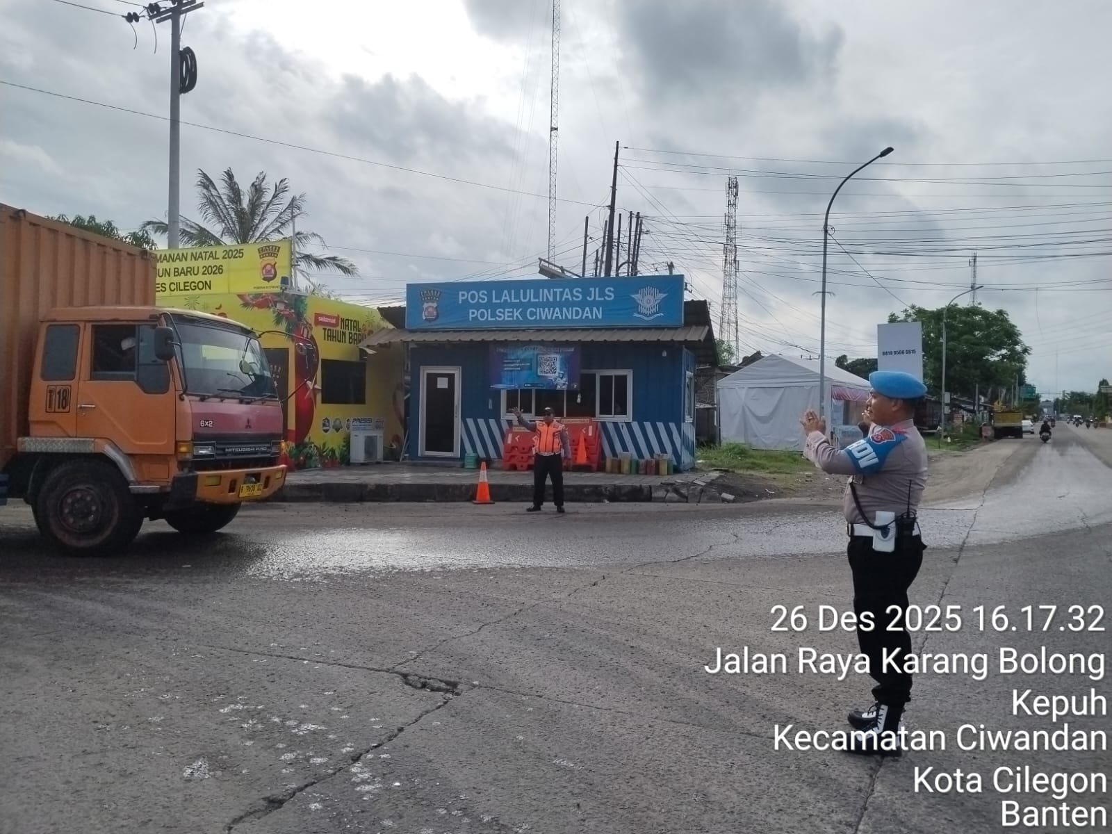 Cilegon - Guna Menciptakan kelancaran arus Mudik Natal tahun 2025 Dan Tahun Baru 2026 yang menuju Pelabuhan Pelindo Dan jalur wisata yang ada di daerah hukum Polsek Ciwandan Polres Cilegon Polda Banten,Pospam 5 Ciwandan berlakukan rekayasa Lalu lintas, Jum'at (26/12/2025).