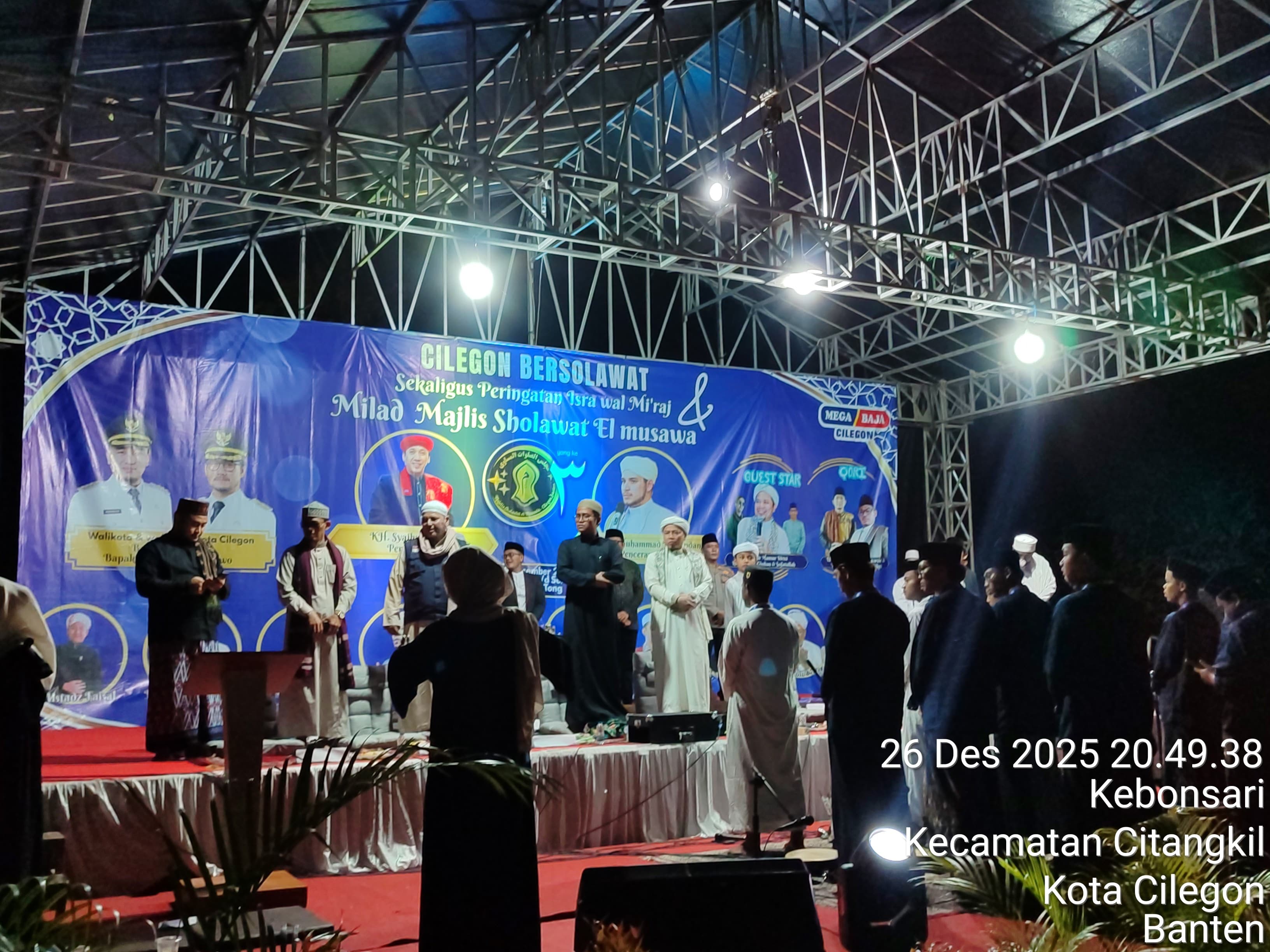 Cilegon - Polres Cilegon melalui Polsek Ciwandan melaksanakan monitoring kegiatan Gema Cilegon Bersholawat dalam rangka Majlis Sholawat El-Musawa ke-3 dan peringatan Isro Mi'raj Nabi Muhammad SAW di Lapangan Tong Alamat, Kebon Sari, Citangkil, Minggu (28/12/2025).