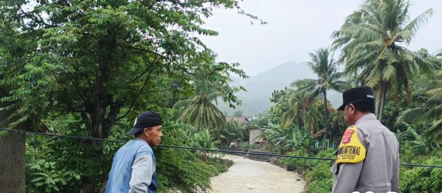 Personel Polsek Anyar Polres Cilegon Polda Banten melaksanakan Patroli kewilayahan mengecek debit air di Sungai pasca Hujan antisipasi banjir di wilayah Kec. Anyar, Senin (29/12).