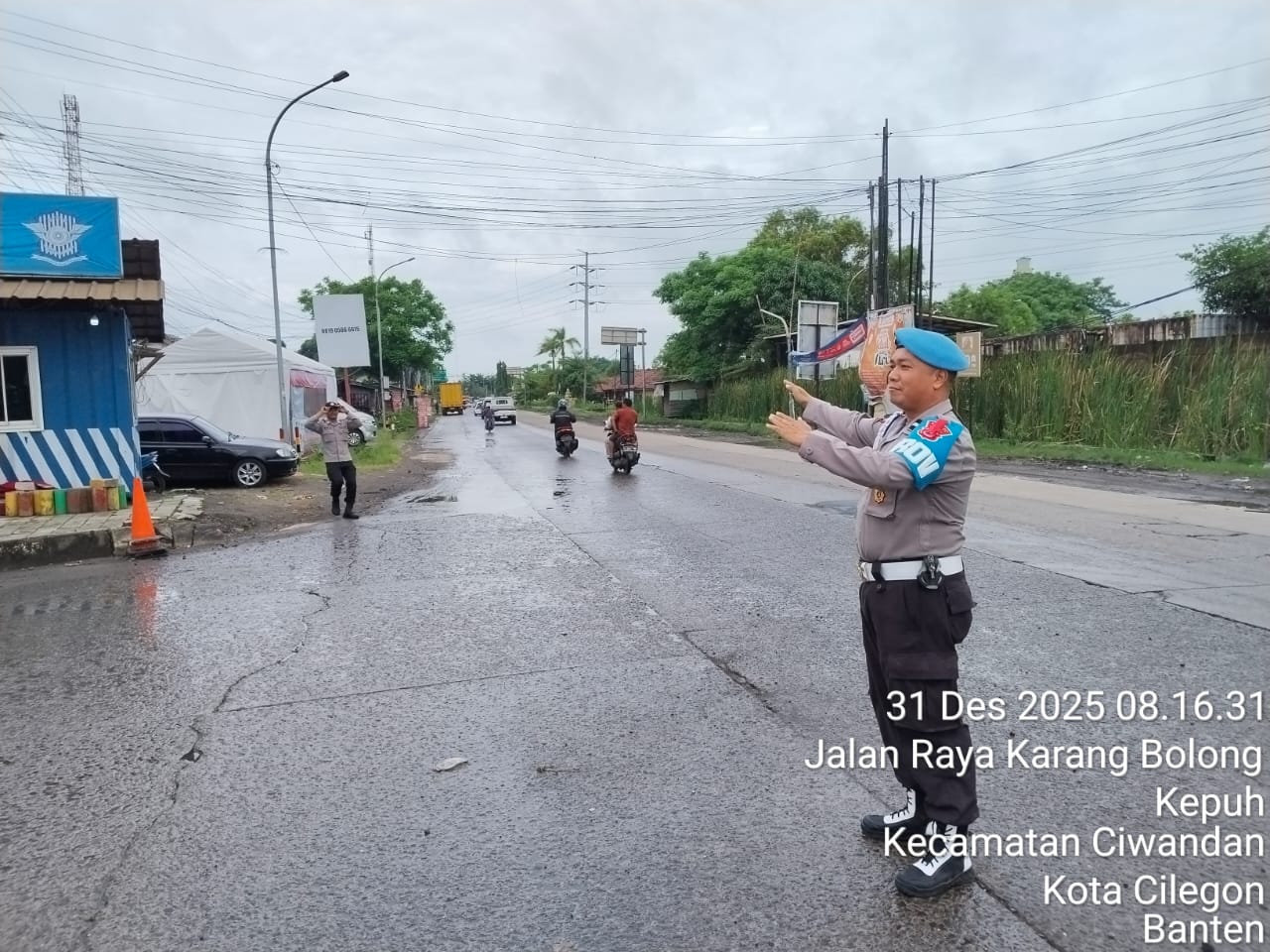 Cilegon - Guna Menciptakan kelancaran arus Mudik Natal tahun 2025 Dan Tahun Baru 2026 yang menuju Pelabuhan Pelindo Dan jalur wisata yang ada di daerah hukum Polsek Ciwandan Polres Cilegon Polda Banten,Pospam 5 Ciwandan berlakukan rekayasa Lalu lintas, Rabu (31/12/2025).