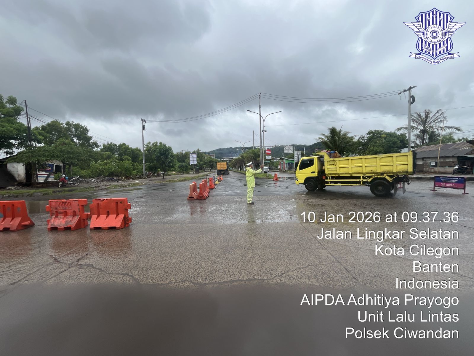 Cilegon - Personil Unit Lantas Polsek Ciwandan Polres Cilegon Polda Banten melaksanakan kegiatan monitoring jalur wisata di depan Pos Lantas JLS Ciwandan, Sabtu (10/01/2026).