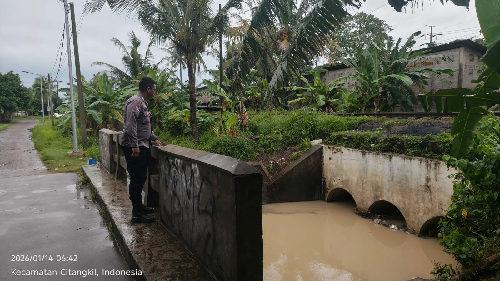 Cilegon - Dalam rangka antisipasi bencana alam personil Polsek ciwandan mengecek debit air di beberapa titik aliran sungai salah satunya yaitu kalimuk RT 005 RW 006 Kelurahan samang Raya Kecamatan citangkil Kota Cilegon, Rabu (14/01/2026).