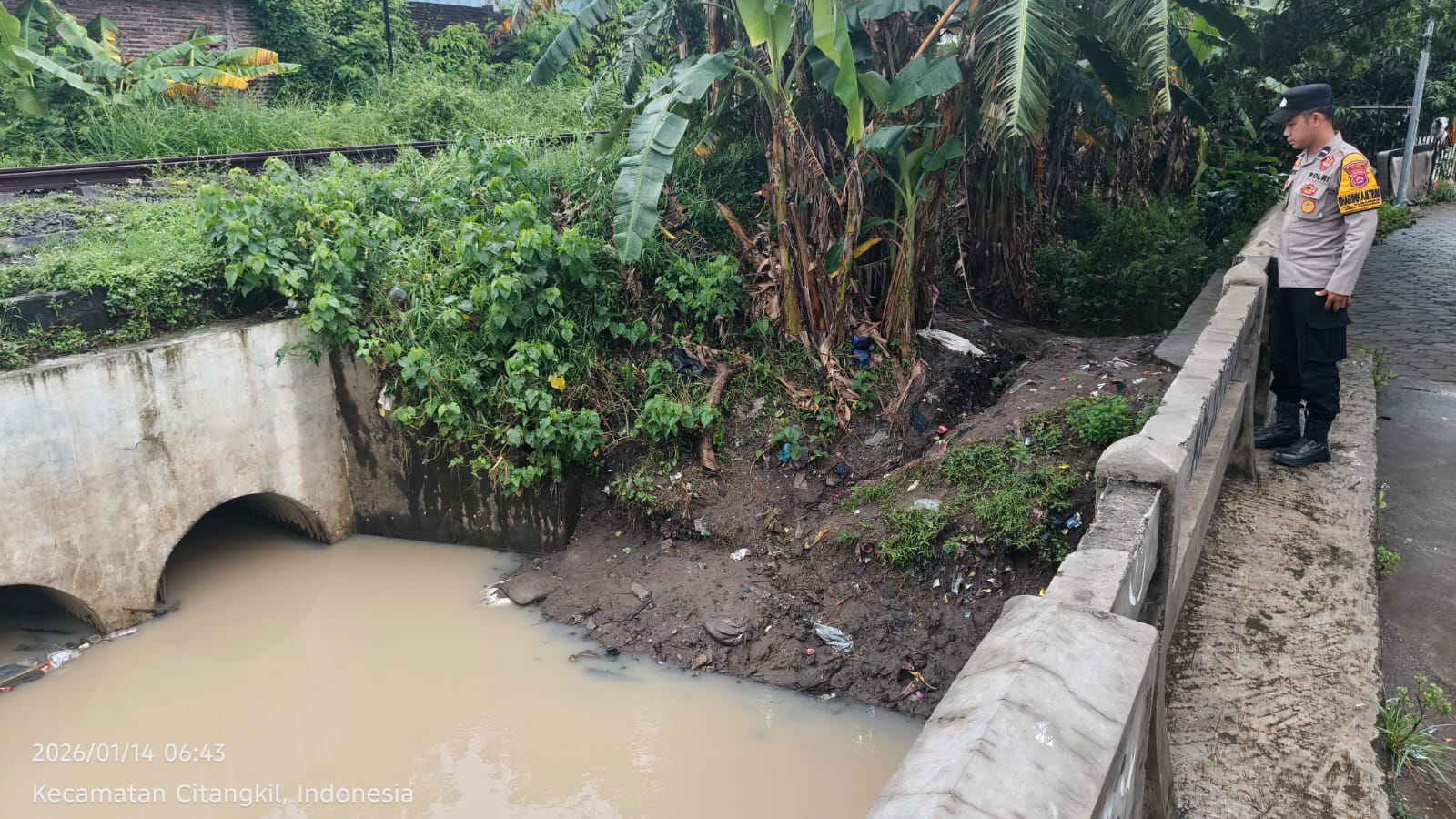 Cilegon - Dalam rangka antisipasi bencana alam personil Polsek ciwandan mengecek debit air di beberapa titik aliran sungai salah satunya yaitu kalimuk RT 005 RW 006 Kelurahan samang Raya Kecamatan citangkil Kota Cilegon, Rabu (14/01/2026).