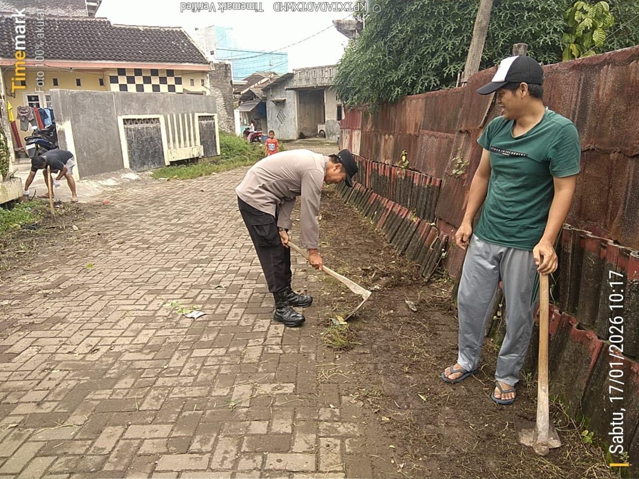 Cilegon - Bhabinkamtibmas Kelurahan Warnasari Polsek Ciwandan Polres Cilegon Polda Banten BRIPKA Heri Siswantoko bersama warga melaksanakan Gotong Royong Kerja Bhakti bersih-bersih Lingkungan Kelurahan Warnasari, Sabtu (17/01/2026).