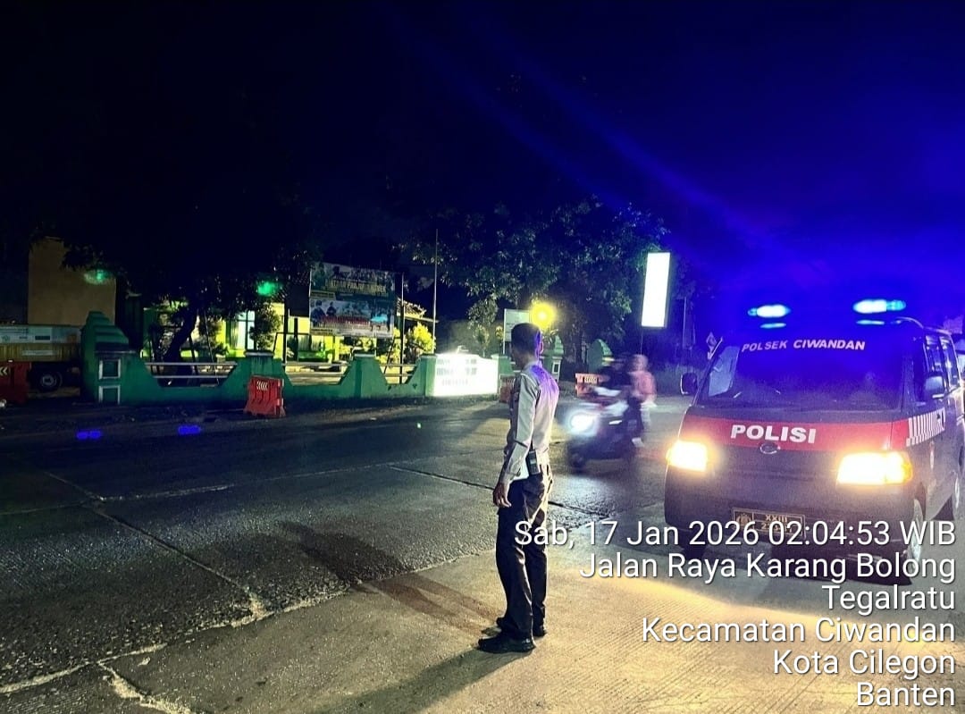 Cilegon - Personil Polsek Ciwandan Polres Cilegon Polda Banten Dalam Pelaksanaan Kegiatan Patroli dengan menyalakan lampu rotator berwarna biru di Daerah Hukum Polsek Ciwandan Polres Cilegon Polda Banten dari malam hingga dini hari, dalam rangka menciptakan situasi aman dan kondusif, Sabtu (17/01/2026).