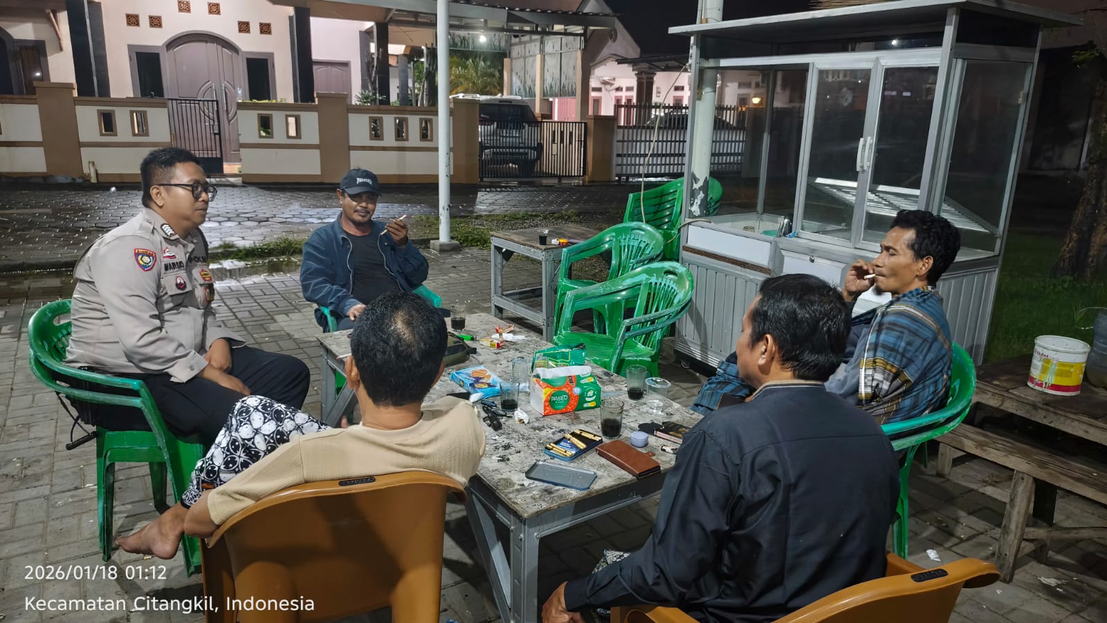 Cilegon - Bhabinkamtibmas Polsek Ciwandan Polres Cilegon Polda Banten Melaksanakan Patroli Kunjungan Malam dan terus memberikan pembinaan dan penyuluhan tentang pentingnya menjaga kamtibmas di daerah hukum Polsek Ciwandan Polres Cilegon Polda Banten, Minggu (18/01/2026).