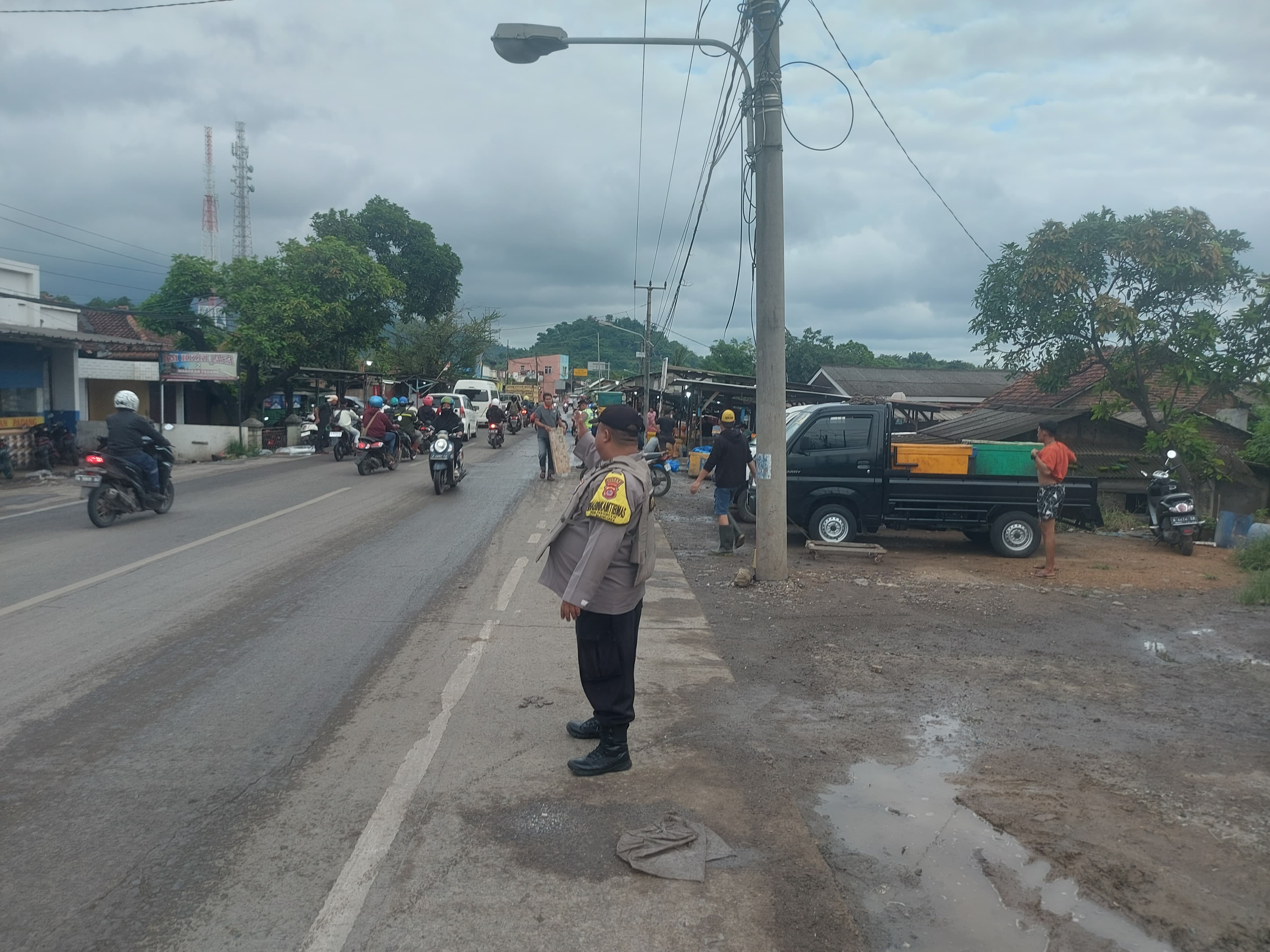 Bripka Tri Handoko dan Bripka Heru Bhabinkamtibmas Laksanakan Gatur Lalin Di Jalan Raya Wadas Bojonegara