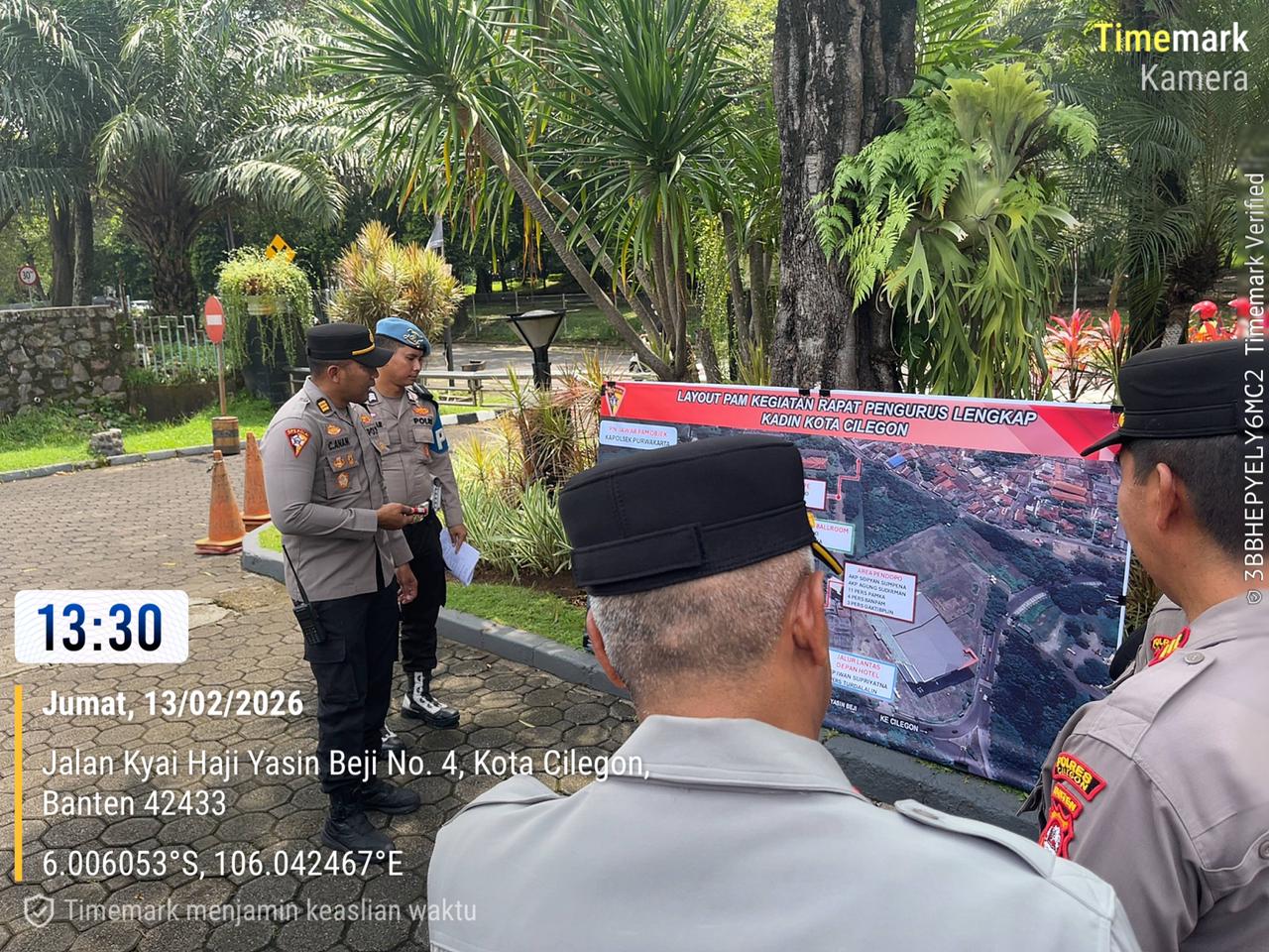 Polres Cilegon melaksanakan apel pengamanan dalam rangka kegiatan Rapat Pengurus Lengkap Kadin Kota Cilegon yang digelar di Ballroom Hotel The Royale Krakatau. Apel tersebut dipimpin oleh perwira pengendali dan diikuti oleh personel yang terlibat dalam surat perintah pengamanan.