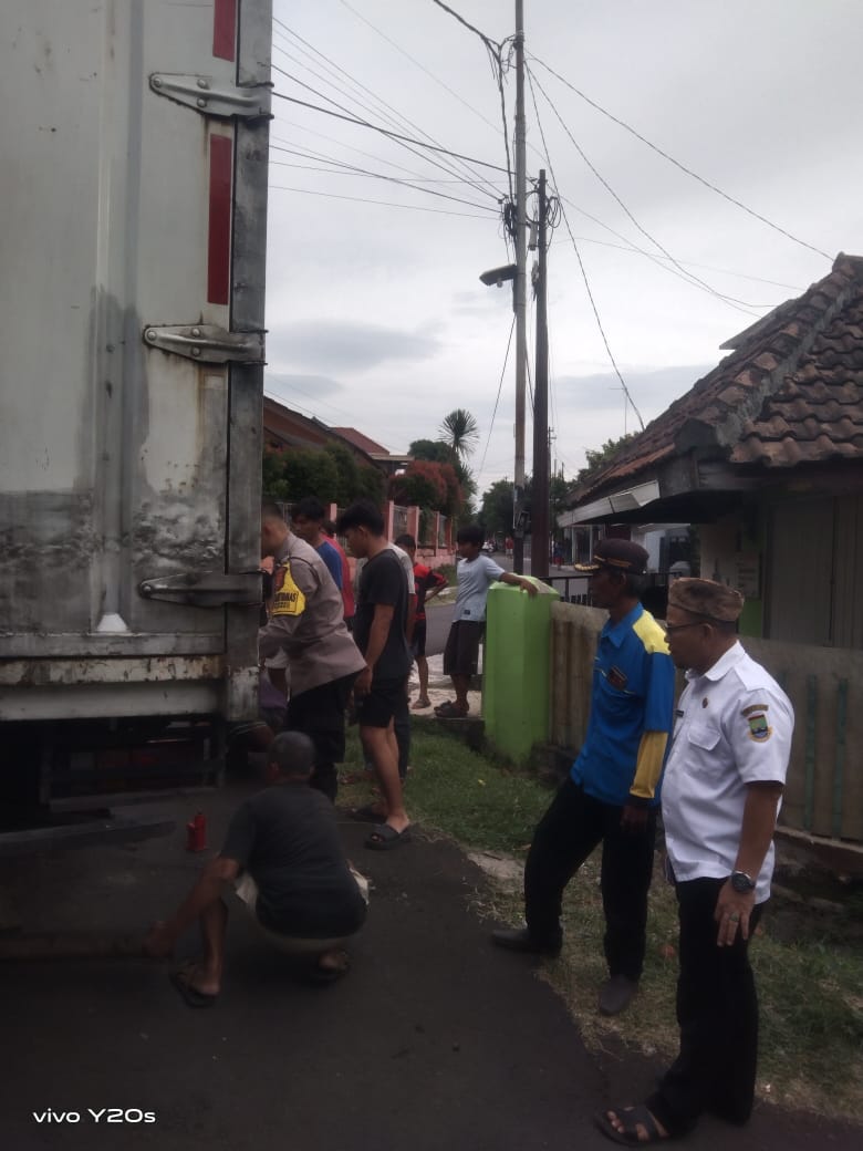 Cilegon - Bhabinkamtibmas Kelurahan Citangkil, AIPDA Warudin, bersama lurah dan linmas, melaksanakan evakuasi mobil box yang terperosok di tengah saluran air di Linkungan Citangkil, RT 03 RW 01, Kelurahan Citangkil, Kecamatan Citangkil, Kota Cilegon. Mobil box yang bermuatan air mineral tersebut berhasil dievakuasi menggunakan dongkrak dan balok kayu, Kamis (26/02/2026).