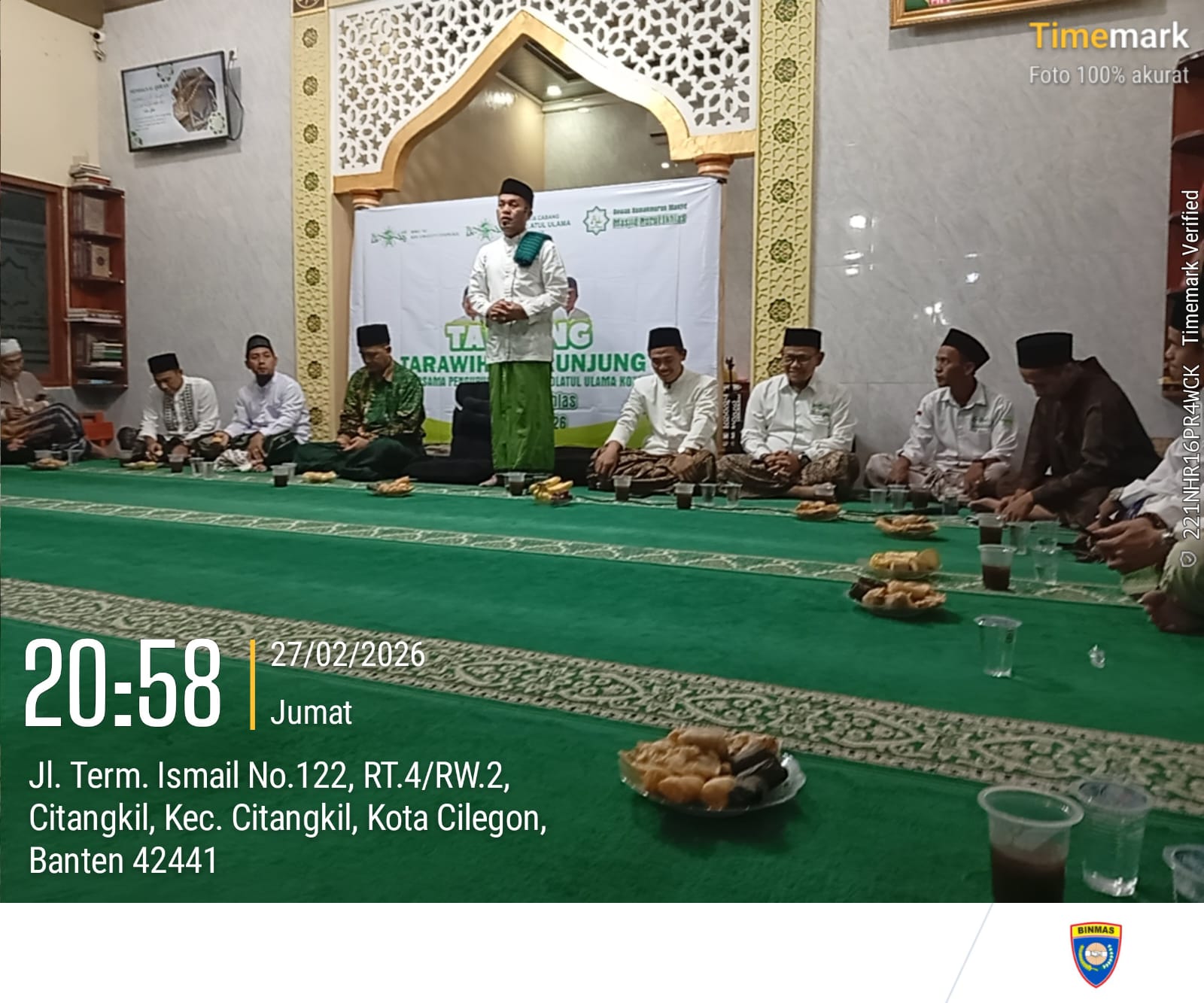 Cilegon - Polres Cilegon melalui Bhabinkamtibmas AIPDA WARUDIN melaksanakan kegiatan Tarwih Keliling (Tarling) di Mesjid Nurul Ikhlas, Link.Tegal cabe RT 01 RW 02 Kel.Citangkil, Jum'at (27/02/2026) malam. Kegiatan ini dihadiri oleh Lurah Citangkil, Babinsa SERKA JANDRI, Ketua DKM, PCNU dan rombongan, serta masyarakat setempat.