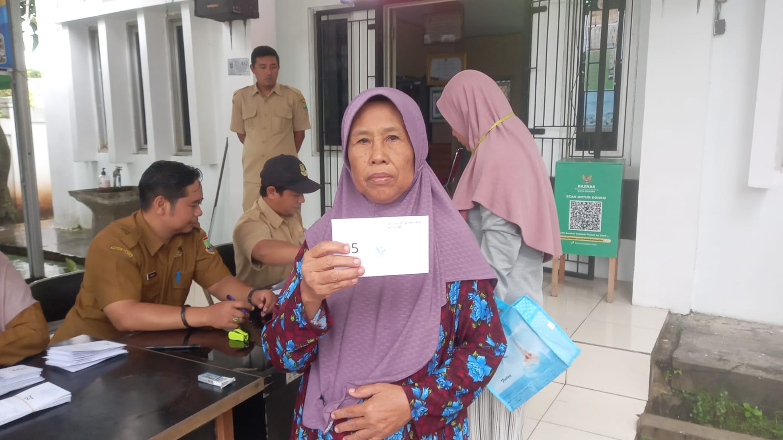 Cilegon - Bhabinkamtibmas Kelurahan Tamanbaru Polsek Ciwandan Polres Cilegon Polda Banten AIPDA Edianto, memonitor kegiatan penyerahan bantuan dari Badan Amil Zakat Nasional (Baznas) Kota Cilegon kepada anak yatim dan dhuafa di Halaman Kantor Kelurahan Tamanbaru, Kecamatan Citangkil, Kota Cilegon, Selasa (03/03/2026).